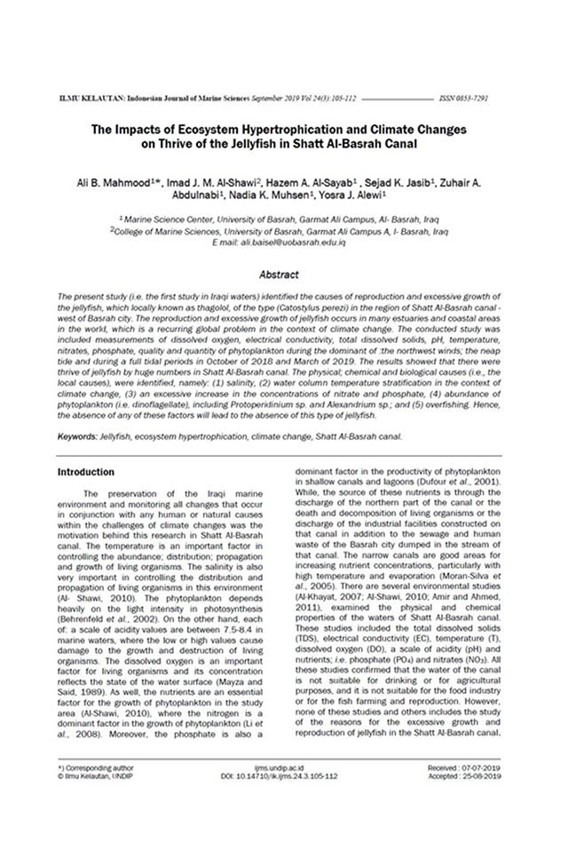 University of Basrah publishes scientific research on the impact of climate changes and the ecosystem on jellyfish in Shatt Al-Basrah.